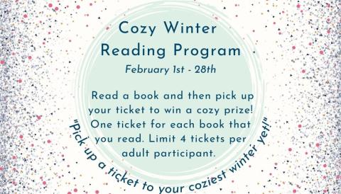 Our "Cozy" Winter Reading Program for adults will be held during the month of February. For each book that is read, visit your local CDL branch and pick up a scratch ticket for a chance to win one of several prizes. "You'll be sure to have the coziest Winter yet!"